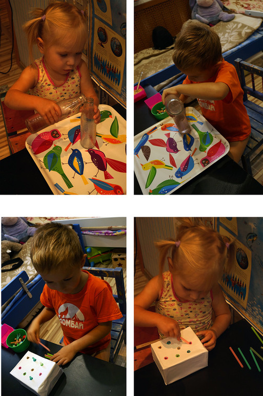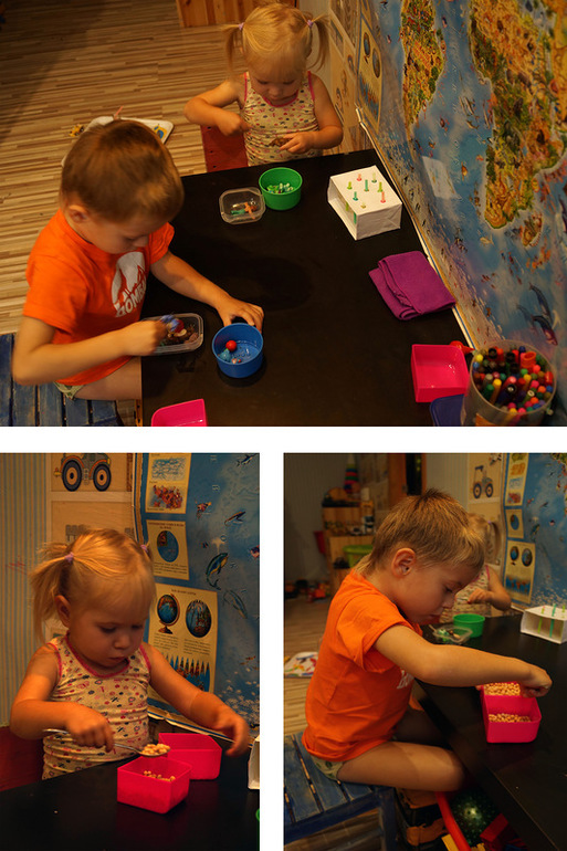 Провели первое занятие в понедельник. Я сделала выводы что Матвею нужно либо более сложное, либо больше по количеству. Матвей с легкостью все выполнил. Буду искать идеи монтессори для более старших детей. Яна тоже сделала все, но делает все в два раза медленнее.