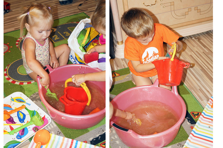3. Переливание воды из одной бутылки в другую. Оба молодцы, быстро и легко справились. Перелив один раз медленно и аккуратно стали делать это быстро, в результате половину вылили. Убрались за собой.
