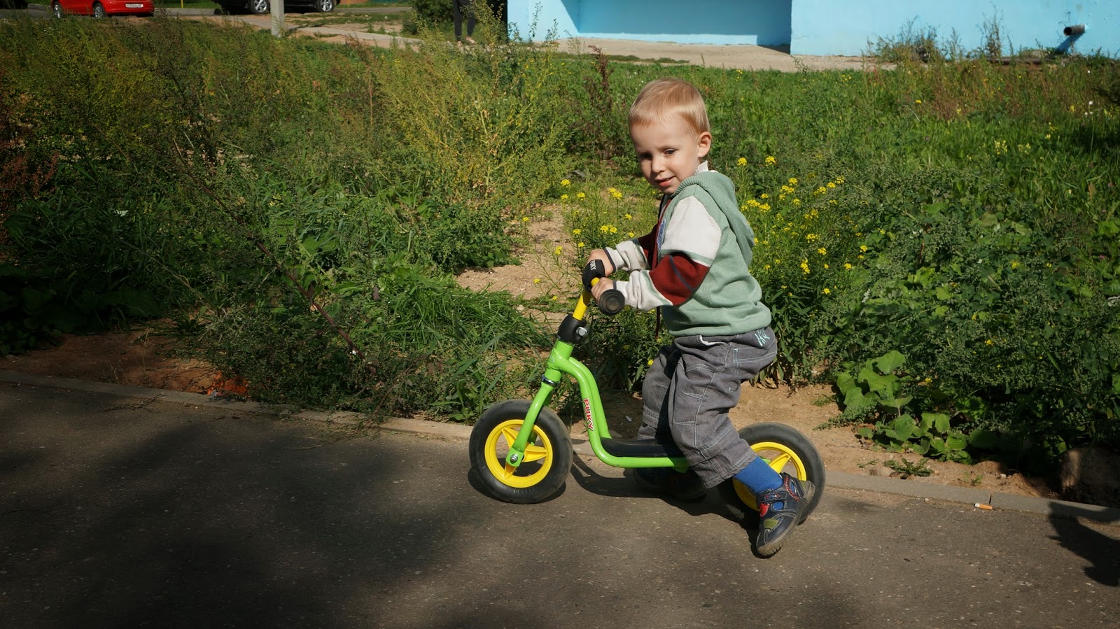 А еще с беговелом мы без коляски можем пройти/проехать очень большие расстояния. Причем всю дорогу я бегу за ним!:)))