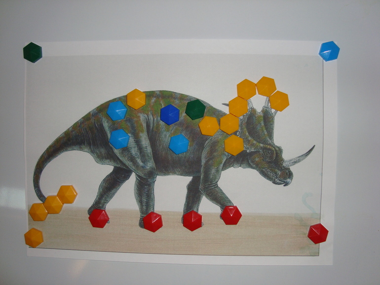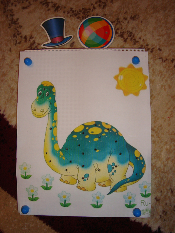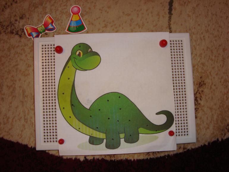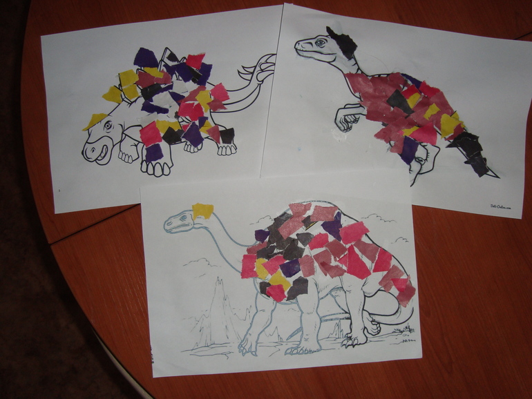 2. Сделала шаблоны динозавриков для мозаики ( плюс взяла детальки от мозаики с аппликацией) и предложила нарядить динозавриков.