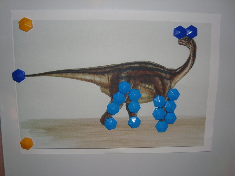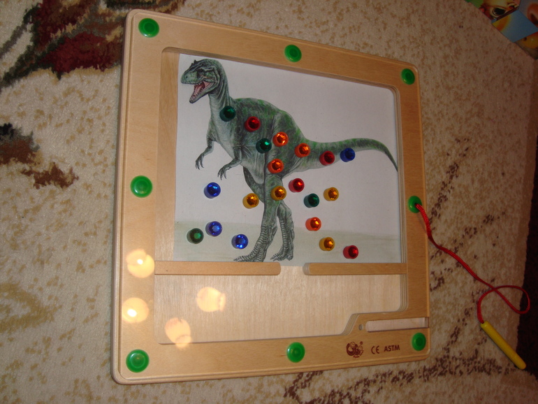 3. Украсили динозавриков детальками магнитной мозаики на магнитной доске.