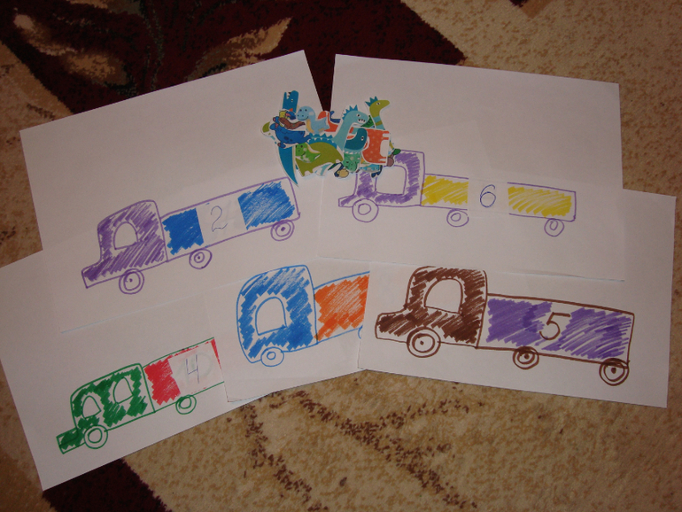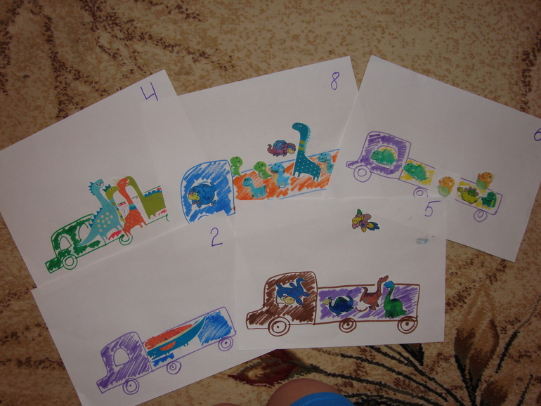 4. Задание на счет. На скорую руку нарисовала машинки с цифрами. Какая цифра- столько динозавров надо приклеить в машину.
