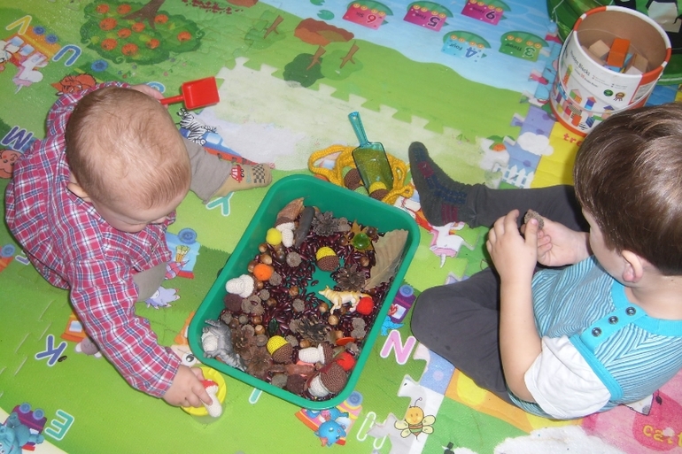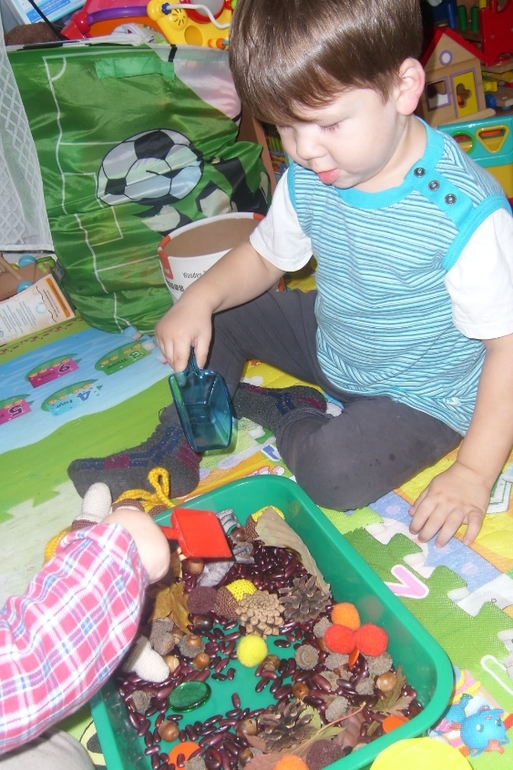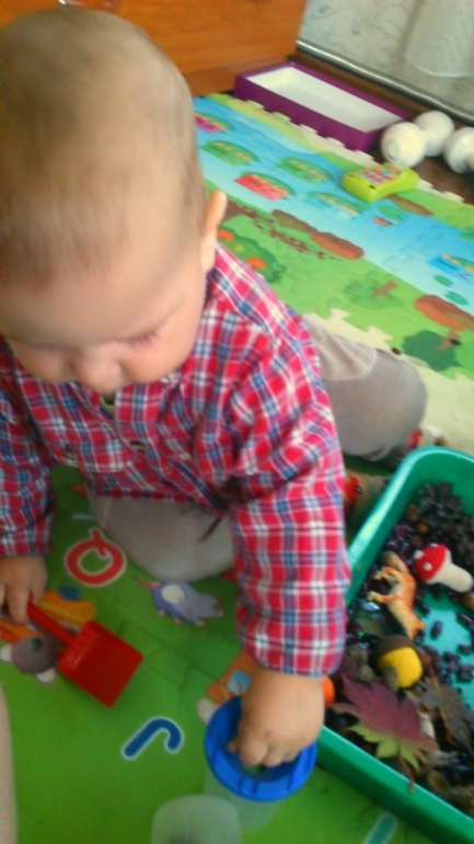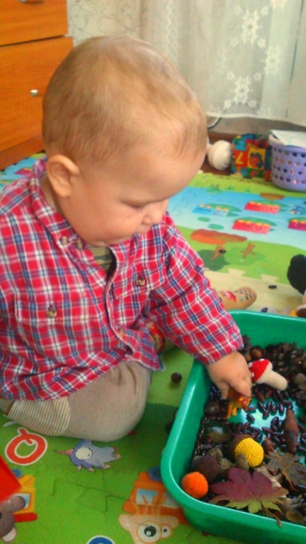 Но потом Дане это наскучило. Мы еще с ним погремели желудями, вязанные у нас как погремушки. Сравнили с настоящими. И Диня унес коробочку к себе на стол.
