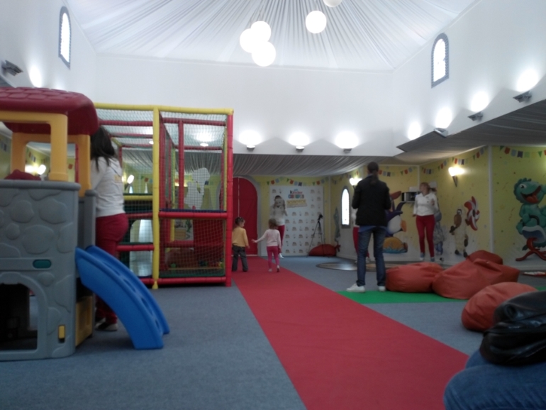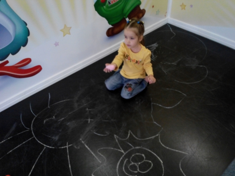 Замок маленький, но уютный. Внутри есть небольшой танцпол, напольные пазлы, лазелки сухим бассейном, трон, дорожки для рисования мелом.