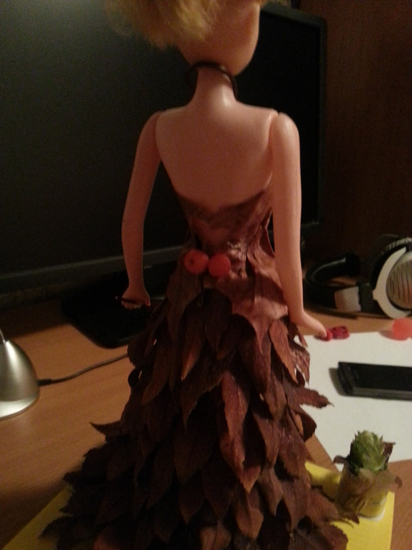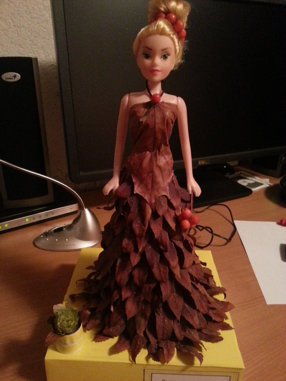 А как на счет того, чтобы ребенок листья приклеивал на юбку куклы? Я например выбрала именно поделку платье для куклы, чтобы дочке 5,5 лет было интересно делать