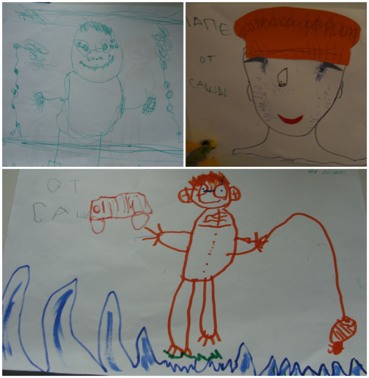 Это портрет мамы, да, я с веснушками и дома часто хожу в очках))) Вокруг меня гирлянды. На втором фото папа в капитанской кепке. Попросил меня вырезать ее, а еще губы и брови. И нос он теперь рисует так, как у папы, с двумя дырочками))))) Мой портрет рисовался раньше. Третий рисунок - папа на рыбалке)))). Стоит на травке, вокруг река, в стороне машина.