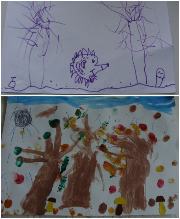 Ежик вчерашний. Пробовал рисовать ежика, как в журнале. Там есть поэтапные рисунки. Потом додумал, что еж бежит по лесу за грибочком. Гриб с точками, это мухомор))) Слева яблоко, его ежик пробежал уже. На втором рисунке осенний лес. Я ему предложила нарисовать хотя б дерево осеннее или аппликацию сделать. Он сказал, что лучше осенний лес)))). Вот, что получилось. Потом еще черную тучку подрисовал и дождик.