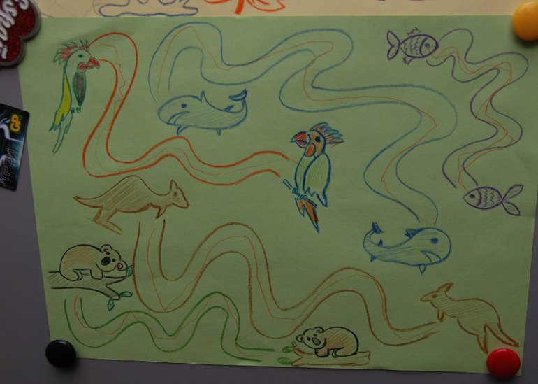 Лабиринты. Вообще у нас с лабиринтами проблем нет, так идейку увидела, думала вдохнуть жизнь в эту мозаику. Как-то не получилось, пришлось идти Сашу кормить, Миша все раскидал, так и забыли про нее. А вообще идея прикольная, нам уже поздновато, мне кажется.