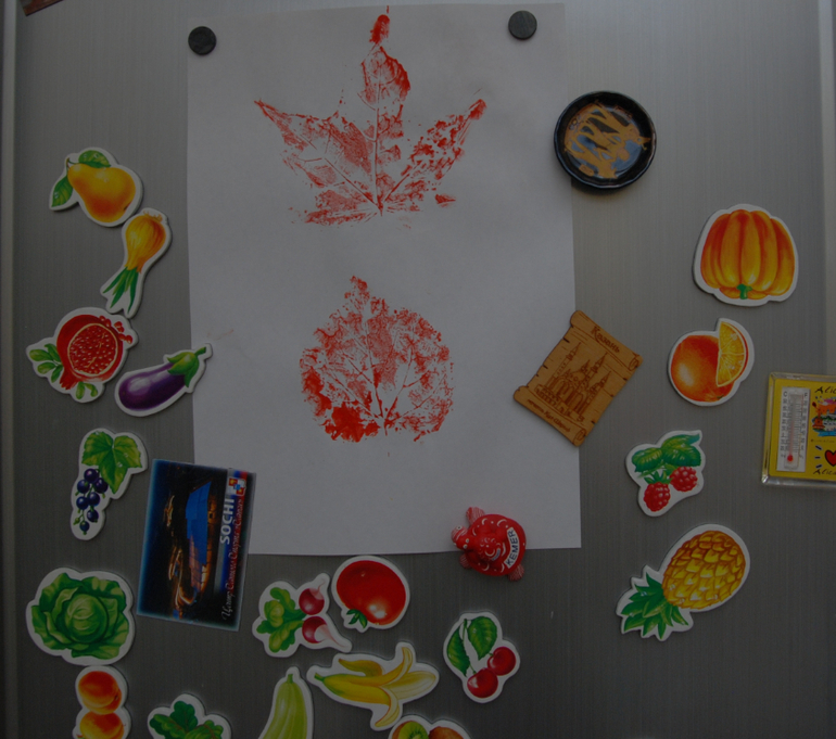 А вот такие отпечатки я давно хотела сделать. В том году у меня путевого ничего не получилось. В этот раз тоже не спервой попытки. Краски гуашь. Миша вообще не оценил.
