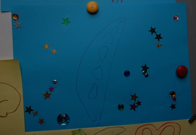 Верхний космос мой, нижний Мишин, я вообще к нему не прикасалась, разве что советами. Пайетки на клей-карандаш, самоклеющаяся камушки - планеты. М. просил еще-еще!