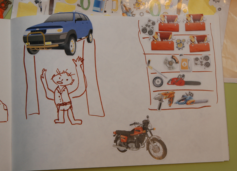 а это так ипровизация на тему наклеек) Нда, художник из меня еще тот. Слева еще машина с эвакуатором, к которым М. колеса клеил, но уже не стала фоткать, совсем страшные картинки.