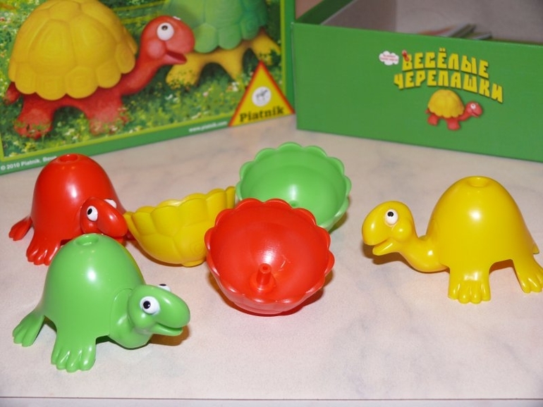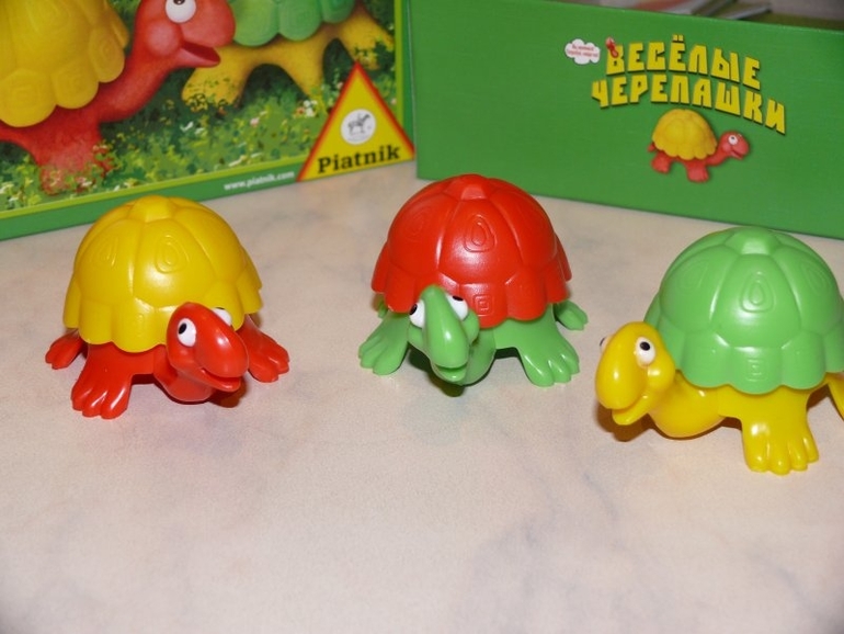 В игру входит 3 черепашки со съемными панцирями красного, желтого, зеленого цвета и 27 карточек с изображением черепашек в разных цветовых комбинациях. Игра идет по принципу «давайте поменяемся панцирями». Например, зеленая черепаха берет себе желтый панцирь, желтая красный и так далее. Кто найдет карточку, которая показывает точно такую же комбинацию цветов забирает карточку себе, выигрывает тот у кого больше всего карточек.