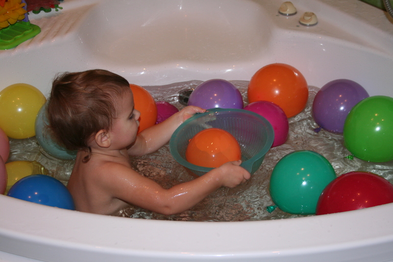 Игры в ваннойОказалось очень интересным занятием купание с шариками. Только шарики надо надувать поменьше, а воды набирать в них побольше