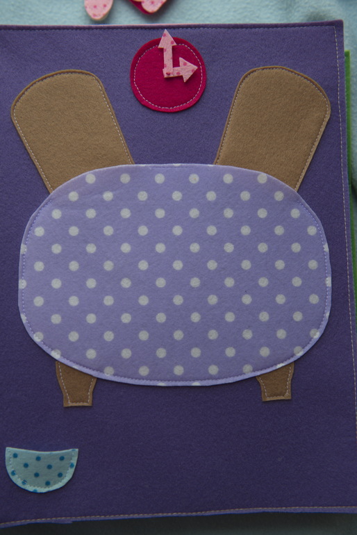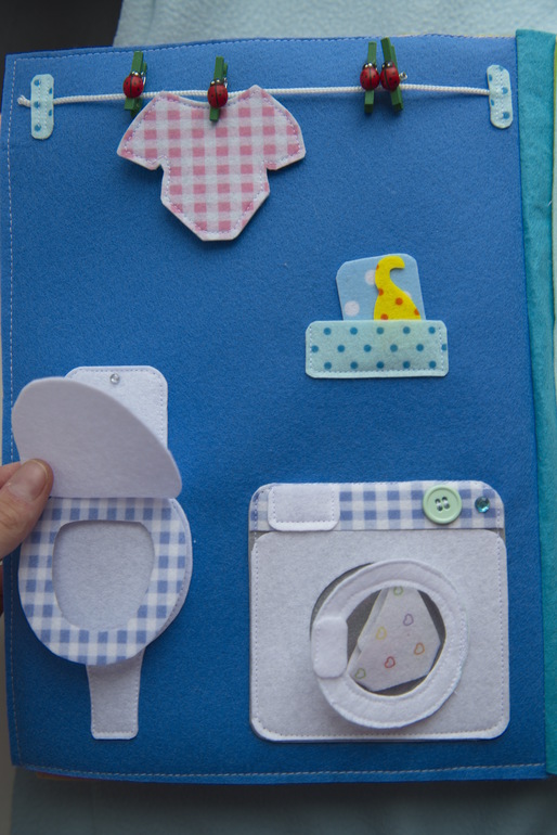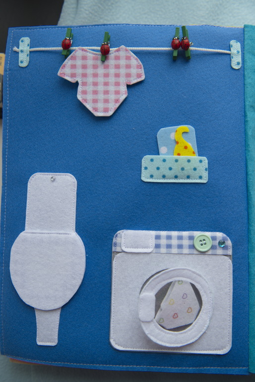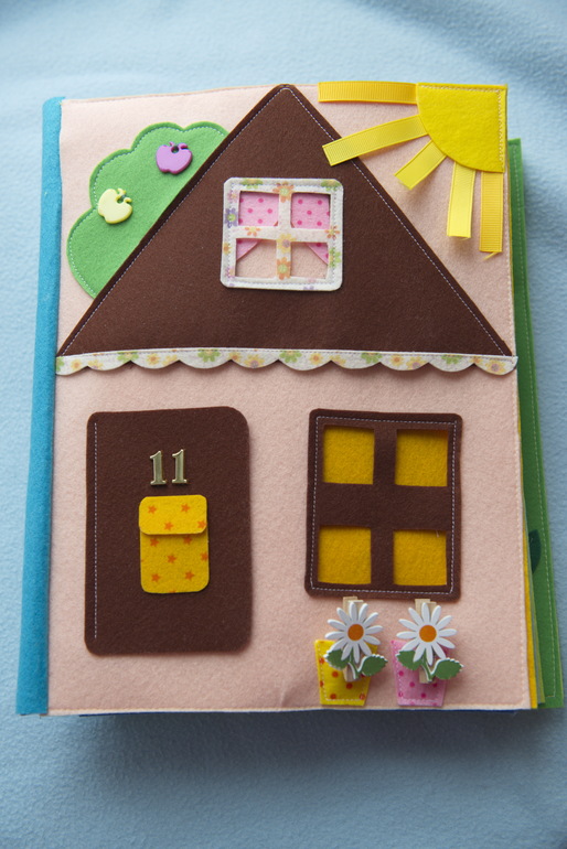 А это дом для наших куколок. В уголке - солнышко с лучиками-ленточками, из-за дома видно яблоню с пришитыми яблочками-пуговками, на двери цифра 11 (день рождения дочки-хозяйки книжки), под окошком два цветочных горшка, в которых растут ромашки-прищепки.