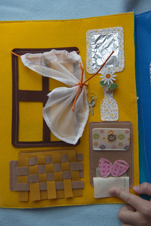 Это прихожая. На окошке шторка двигается и ее можно прихватить шнурочком на бантик. Коврик можно самому сплести из фетровых ленточек. В шкафчике две полочки, туда можно поместить обувь (на липучках), а на шкафу стоит вазочка, в которую можно поставить сорванную у дома ромашку.