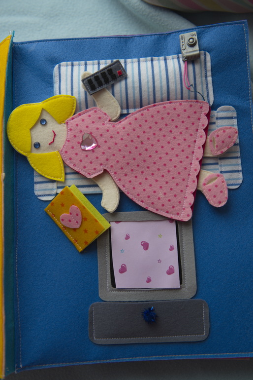 Это маленькая гостиная. Куколка прилегла отдохнуть на диванчик, в одной руке у нее пульт от телевизора, в другой - книжка на липучке. В телевизор можно вставить любую картинку-мультик, дочка первый попавшийся клочок туда поместила ))