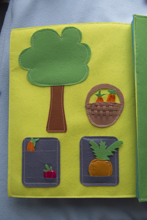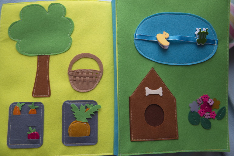 Ну а это дворик. Здесь на грядках растут морковь, свекла и тыква. В корзинку можно положить что-нибудь. В пруду "плавают" уточка и лягушка-прищепки. В будке живет собачка. Небольшая клумба состоит из нашитых цветов.