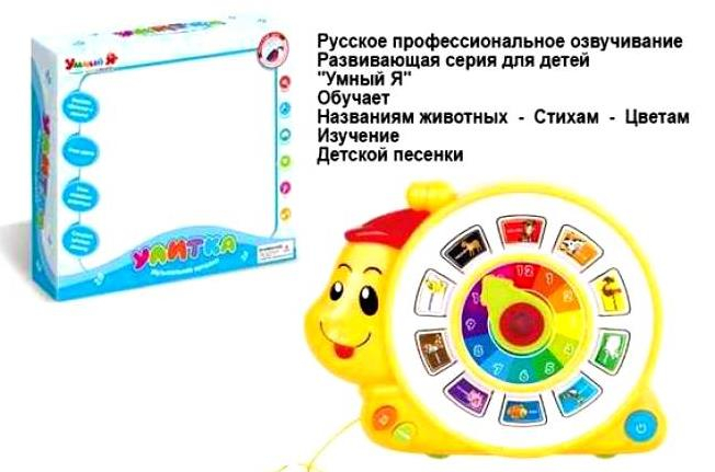 Улитку любит. Улитка издает звуки животных, проговаривает их названия. Есть кнопочка с песенкой. Ещё есть режим, где называют цвета, но он пока не нравится.