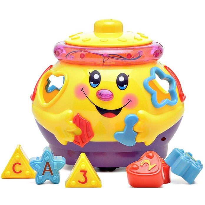 Сортеры. Простой кубик и горшочек. Кубик Летуню совсем не заинтересовал из-за этого таких больше не покупала, так и валяется. В горшочек любит вставлять фигурки, да и просто складывать в него всякие мелкие игрушки. Музыкально-двигающаяся часть горшочка у нас не прижилась, первое время доча просто боялась его, а потом, после пары удачных полётов, что-то в нём сломалось.