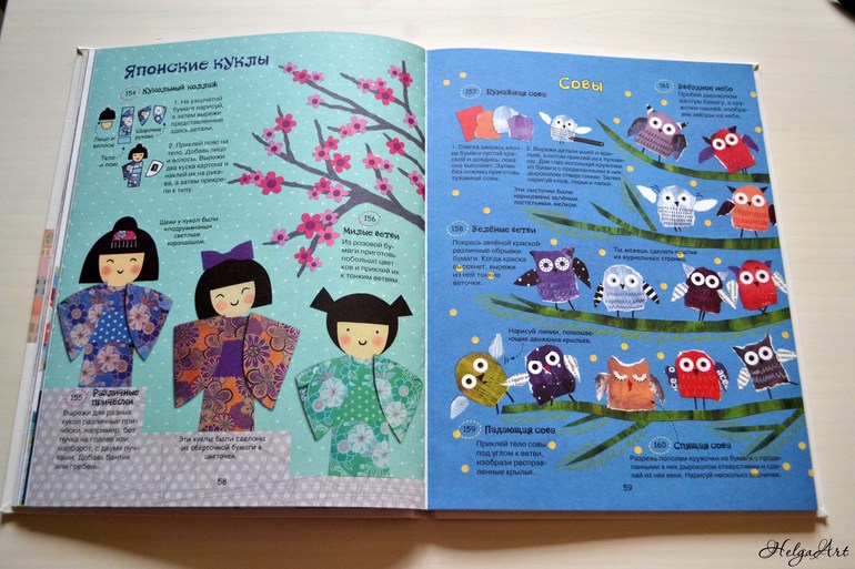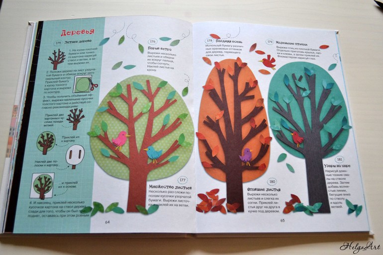 Внутри 365 идей бумажных поделок - просто аппликации, обрывные аппликации, поделки из фольги, картона и коробок, 3D-пазлы, сборка коллажиков. Сфотографировала несколько разворотов.