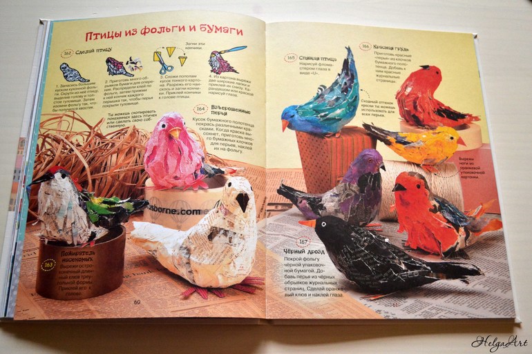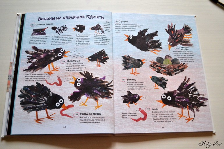 Не могу назвать книгу мега-оригинальной (много аналогичных поделок можно найти и в сети), но о покупке не жалею. Все-таки думаю, что идеи отсюда будут воплощены гораздо раньше, чем из многочисленных закладок на компьютере. Сама книга издана отлично - большой формат, плотный офсет, яркие рисунки. Просмотр заставляет мозги шевелиться и самой придумать что-нибудь занятное для своего ребенка. Еще мне нравится позиция автора насчет используемых материалов - для работ предлагается использовать обрывки журналов и газет (ну с газетами перебор, конечно. Нечего ребенку их в руки давать. А вот журналы вполне можно в дело пустить), старые рисунки, оберточную бумагу. То есть специальных приобретений делать не придется, в доме всегда найдется что-то ненужное, из чего получится шедевр.