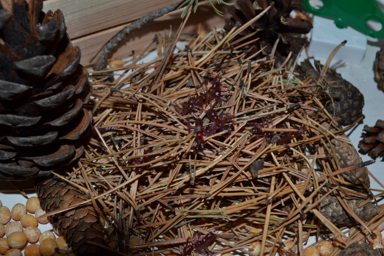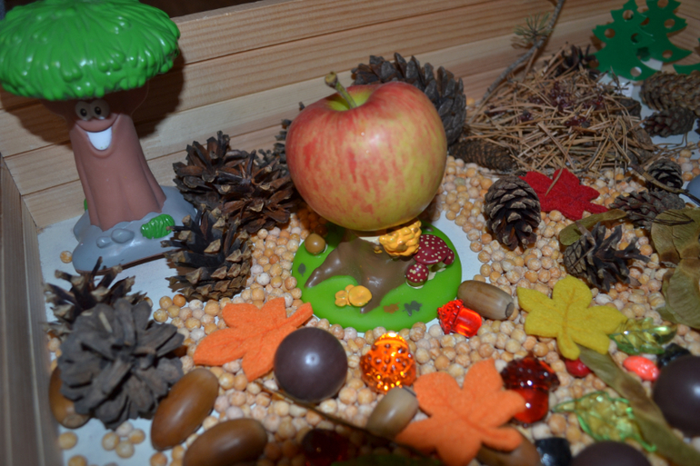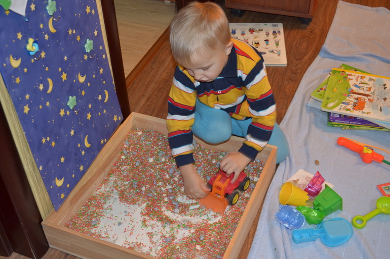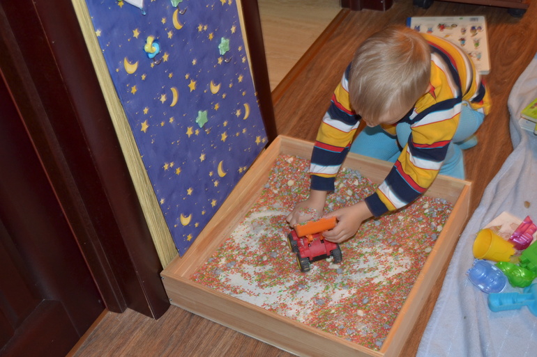 Как то сам достал у меня из шкафа все крупы, высыпал в контейнер и возился. Осеннюю коробочку мы с ним уже вместе делали, думали что можно в нее добавить. Хотела сделать с ним осенние деревья, но не захотел, принес готовые, объяснила, что они зеленые, а осенью должны быть желтые... все рано оставил)