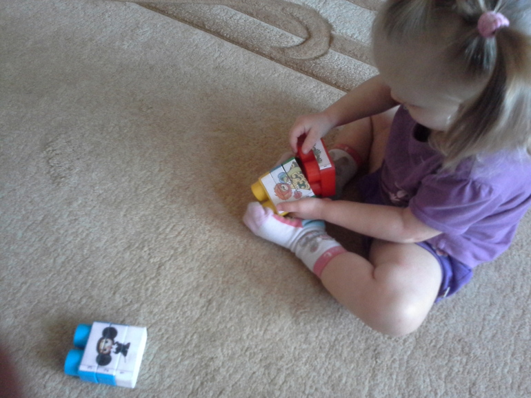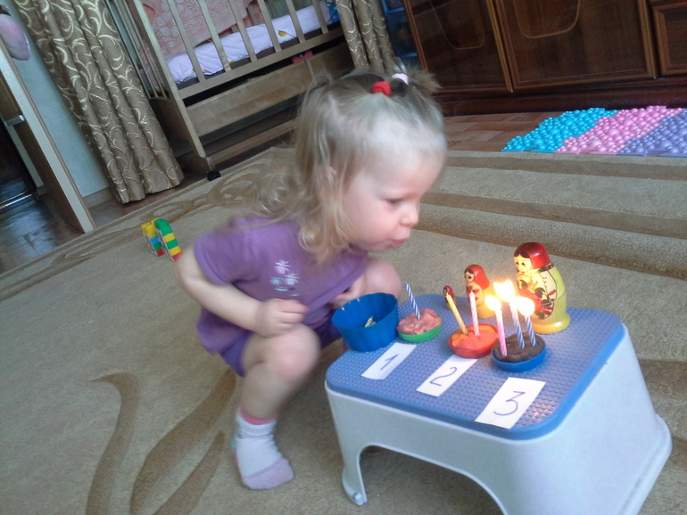 Женечка, спасибо тебе за идеи!!Сегодня ВАУ!!! проводя игру на задувание свеч (как у вас в тортиках), мы научились дуть!!! сколько счастья у меня было.. и  у Артема тоже!! а то дул все носом или с широко открытым ртом)) все запечатлела на видео.. и УПС не заметила, как Артемка подпалил себе немного ресничек....А ближе к вечеру смастерила пазл из конструктора. вертел с интересом))
