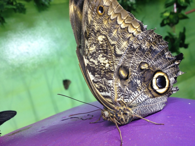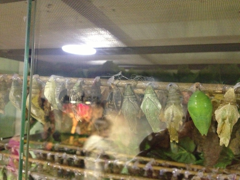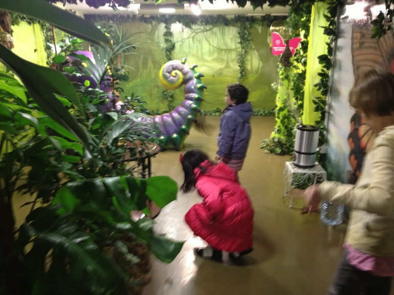 Дом бабочек. Девчонкам понравилось там больше всего. А мы с мужем впали в уныние. Небольшая комнатка с низким потолком. Огромные бабочки летают, сидят на растениях посередине комнаты или на стенах или на полу в полумертвом/мертвом состоянии. Схватить их за крылья детям не составляет ни какого труда, ну и разрешено (на ВВЦ в доме бабочек трогать их не разрешали). Поэтому много бабочек-инвалидов (очень жалко). Но бабочки очень красивые.