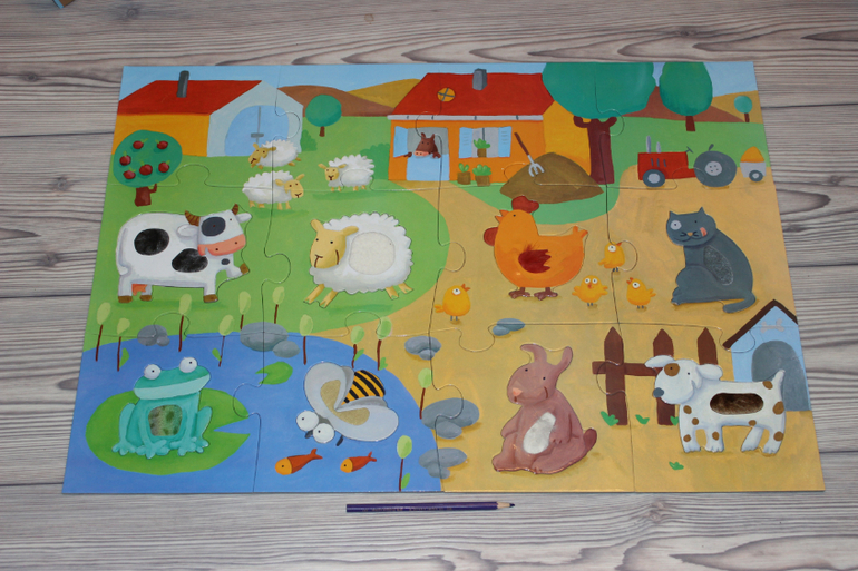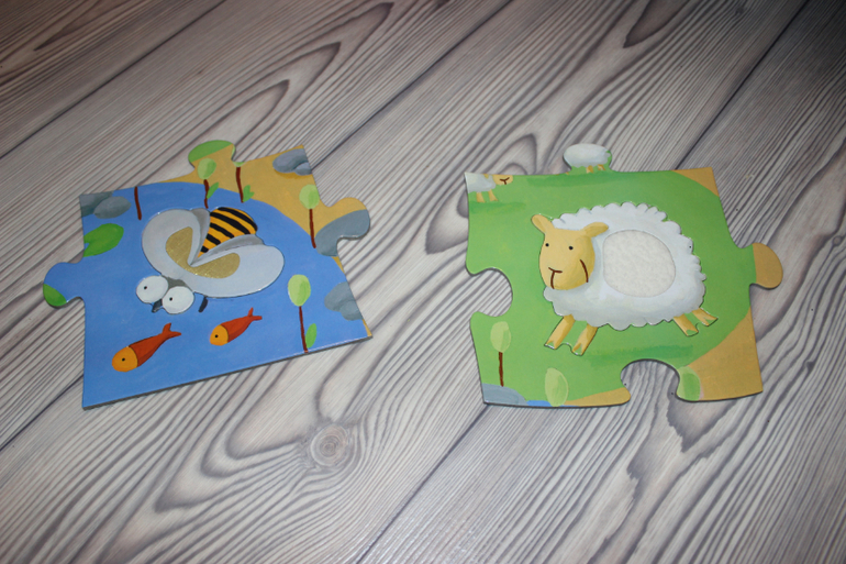 Размер у пазлов немаленький. Детской ручке их удобно брать.