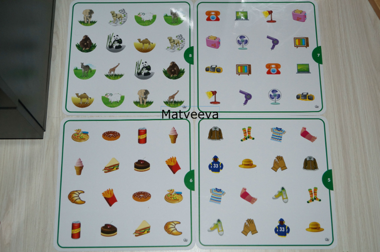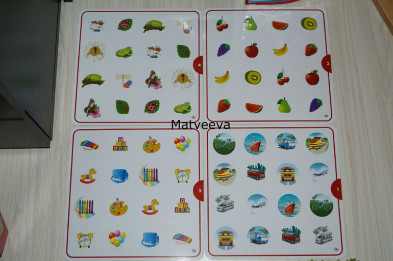 В наборе 4 двусторонних карточки на самые разнообразные темы: фрукты, транспорт, насекомые, игрушки, животные, продукты, одежда, вещи