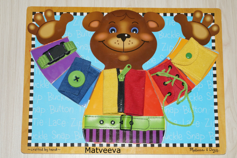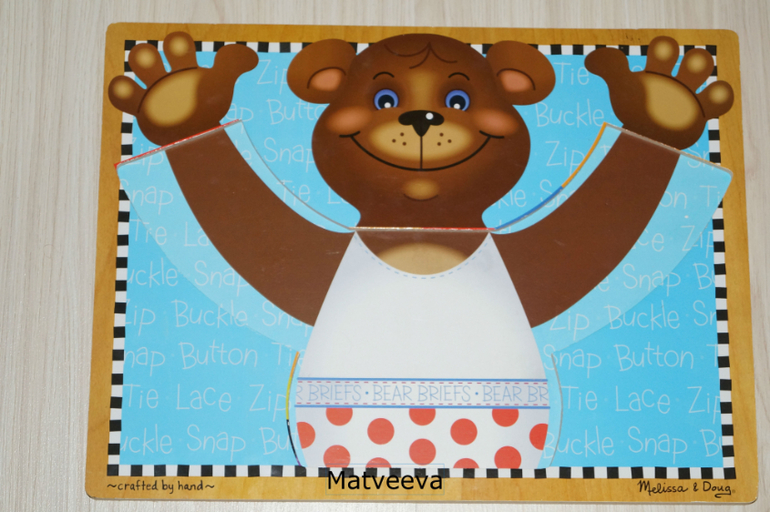 Мишку можно раздеть)) а потом постепенно одевать, осваивая новые навыки))
