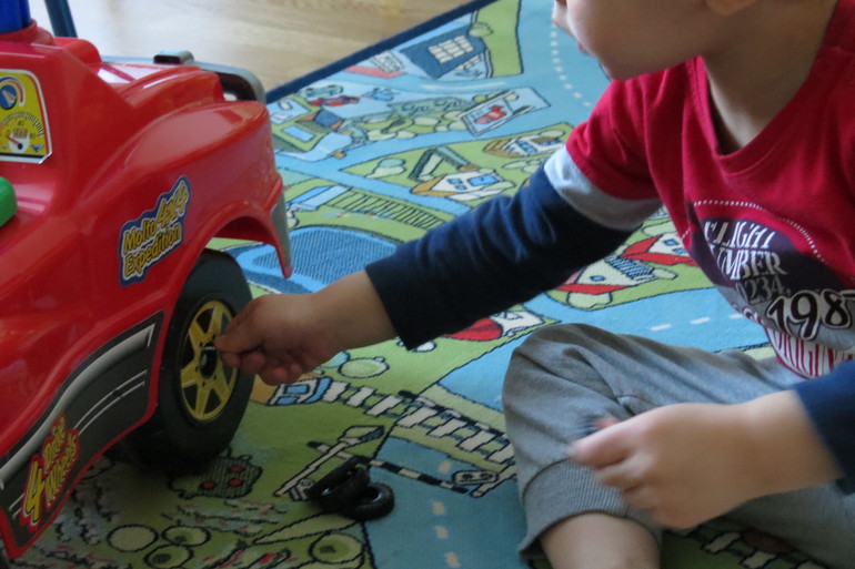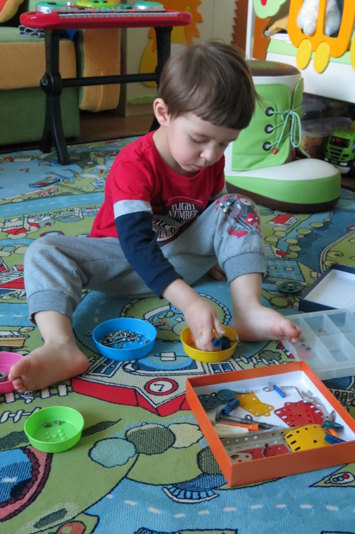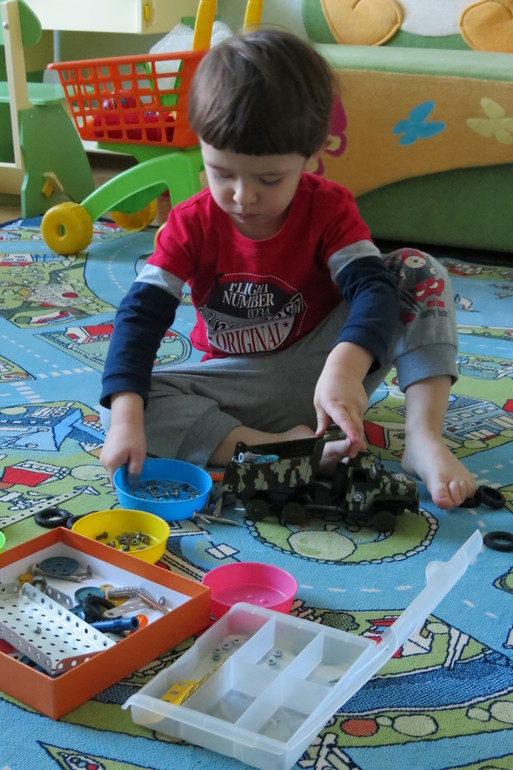 Конечно Лёня использует конструктор не по назначению, ничего конкретного он построить пока не может. Но ему интересно просто перебирать винтики, гаечки и т.п. Лёня перекладывает детальки, сортирует их по тарелочкам. И самое главное, он с помощью настоящих железок ремонтирует свои машины.