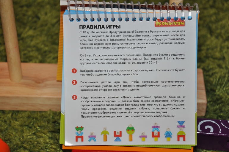Информация о рекомендуемом возрасте на коробке и в инструкции расходится: на коробке зачем-то написано "3-6", хотя в инструкции есть два варианта собирания - с 18-36 мес и с 3 лет. Тут я не соглашусь с обоими вариантами производителя: начинать надо однозначно раньше трех , в 1,5-2 года точно. Но для детей 5-6 лет игра уже,скорее всего, будет неинтересна. Так что, на мой взгляд, возрастные рамки для этой игры - от 1,5 - 5 лет.