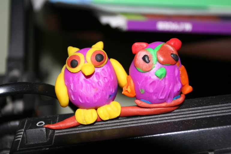 Но мы не сидим сложа руки. Купили новый пластилин "Кроха" "Луч" (яркий, мягкий!), открыли сайт Марьи Новацкой , выбрали "тему" и приступили. Даше я показала только итоговую картинку. Только начала ей объяснять, Темик с довольным видом откусил кусок пластилина (он лепит с нами, и всеми безобразиями занимаемся вместе.. куда уж без него...)... Пока я вытаскивала кусок, Дашик уже быстренько наваяла. Я свою Совушку доделывала одна (вернее с Темиком, играющим с остальными брусками). Удовольствия море! На веточку посадить (а именно слепить) придумала Даша.