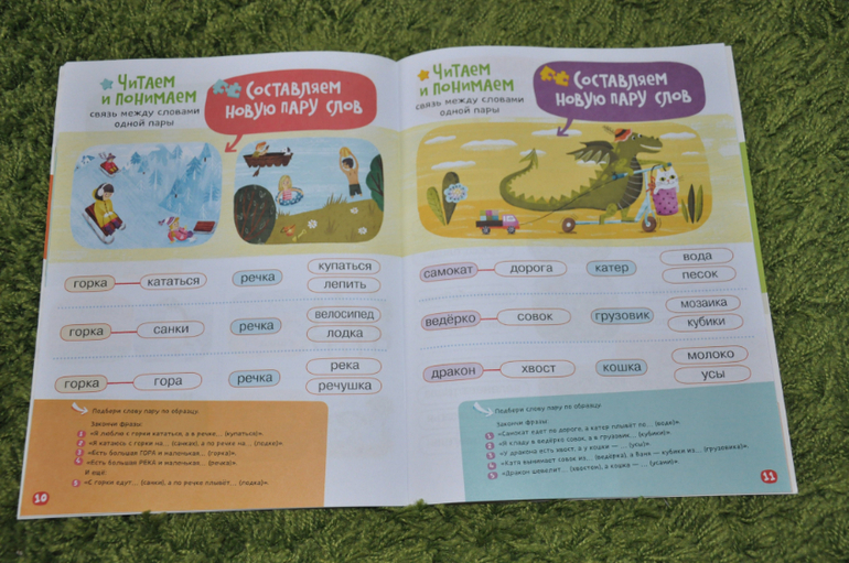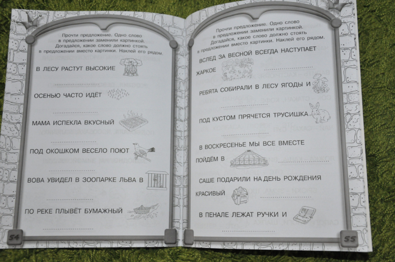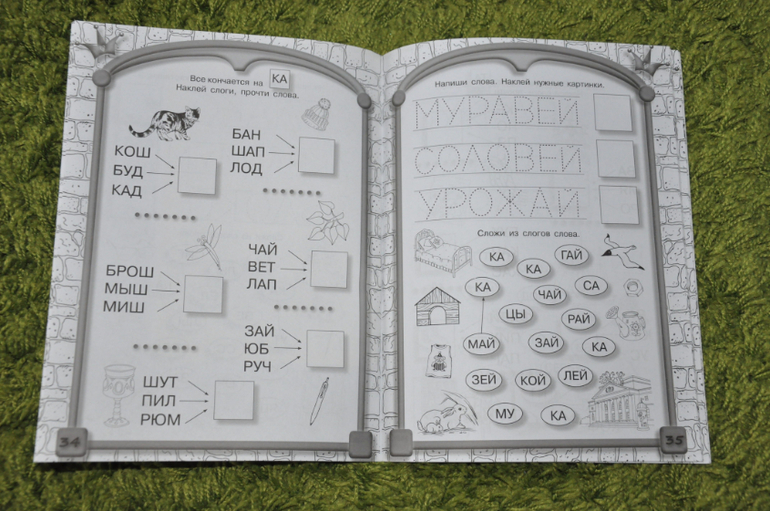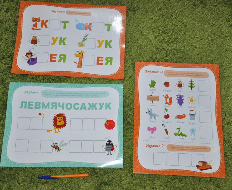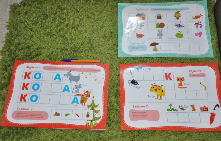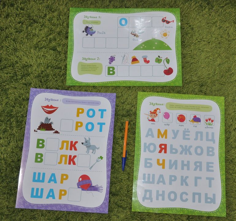 Задания однотипные - составить слово, правильно подобрав буквы. Очень помогает в освоении техники чтения, запоминания последовательности букв и т.д. Хороший вариант для начинающих читать.