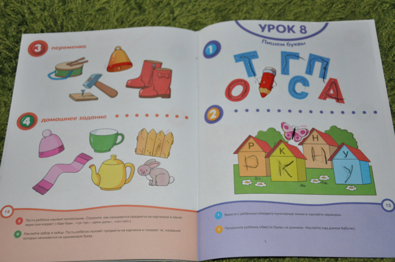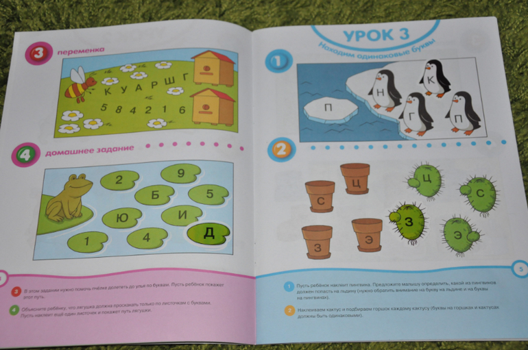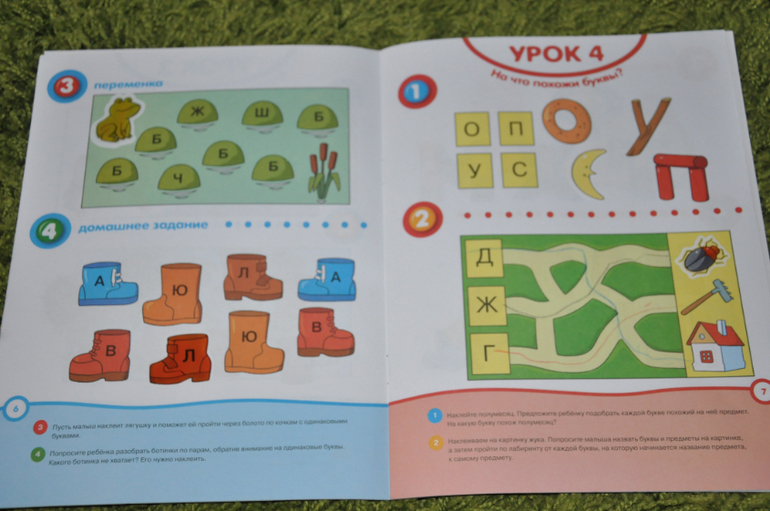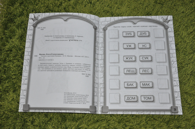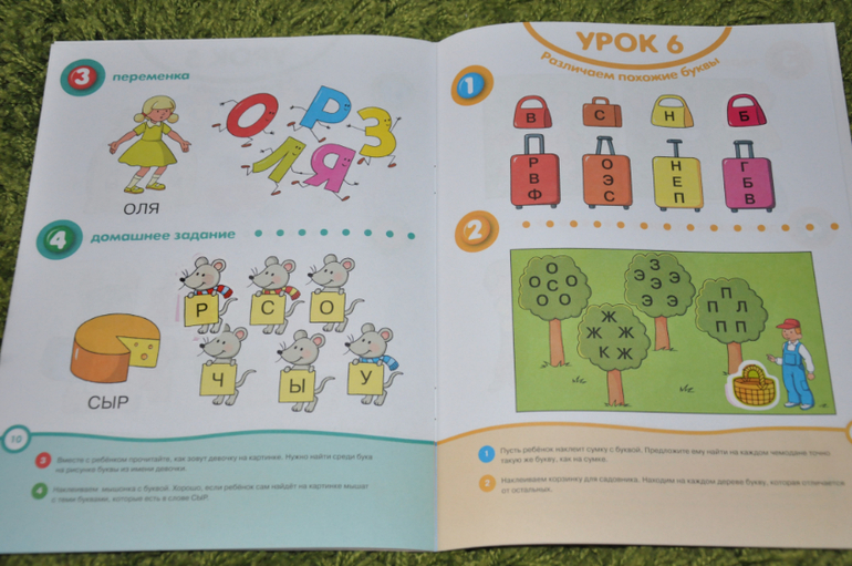 Еще одно пособие для начинающих, тоже с наклейками и игровыми заданиями, на этот раз от Олеси Жуковой. Развороты: