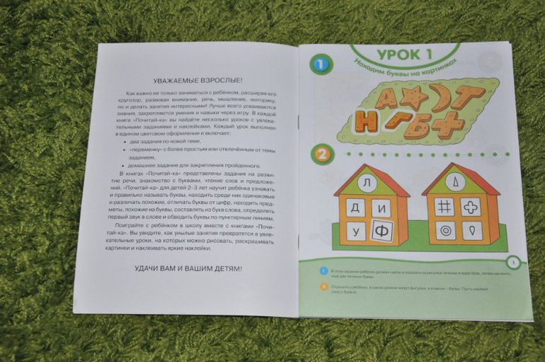Еще одна неплохая серия развивающих пособий от "Махаона". С "Почитай-кой" мы как раз и начали соединять буквы в слоги (параллельно я использовала все те же карточки с буквами). Все задания в игровой форме, от простого к сложному, с пояснениями для родителей и, конечно, с наклейками!)) Вот несколько разворотов: