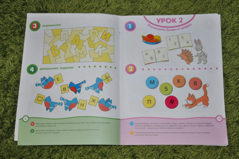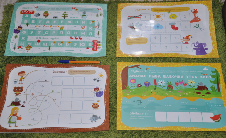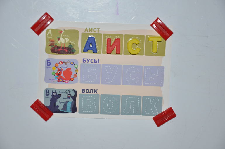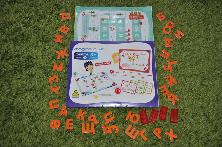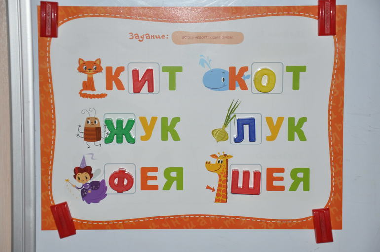 Этот набор тоже состоит из букв и заданий с ними (плюс магнитная доска и магниты для крепления заданий).