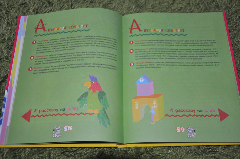 Очень подробная и полезная книга с кучей стихов, игр и методических указаний для родителей! Задания тоже строятся по принципу: "от простого к сложному". В конце книги даются достаточно большие тексты, так что, думаю, дорастем мы до нее нескоро: когда будем уже спокойно читать предложения )) А развороты вот: