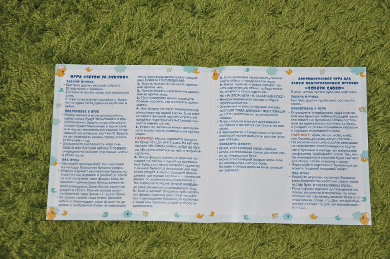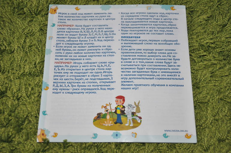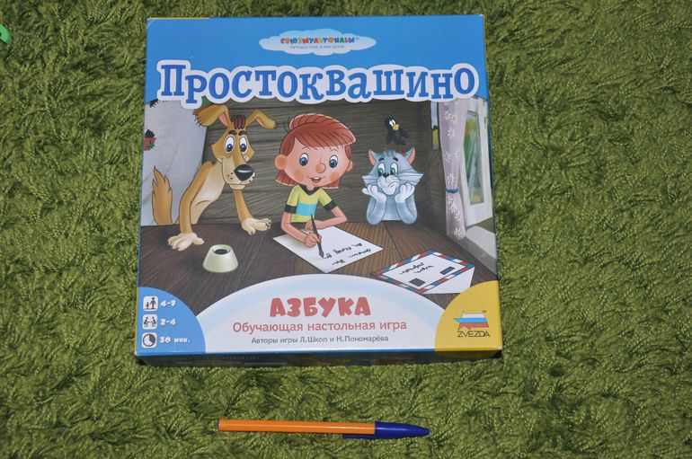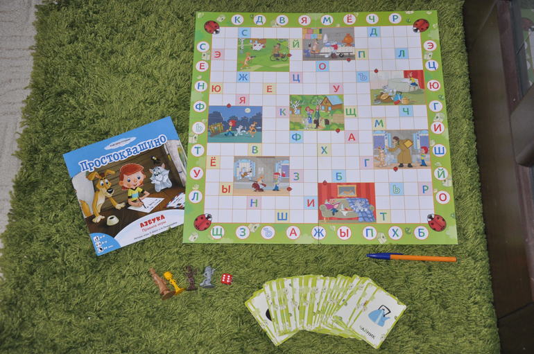 Эта игра была куплена мною в надежде на помощь в изучении алфавита на волне наше любви к героям Простоквашино. Но, честно говоря, помощи, она особой не оказала - правила достаточно путаные для нашего возраста и сейчас, зато фигурки персонажей пошли "на ура"))Так что пока мы только пытаемся читать короткие слова на карточках, а до игры, надеюсь, скоро дорастем.