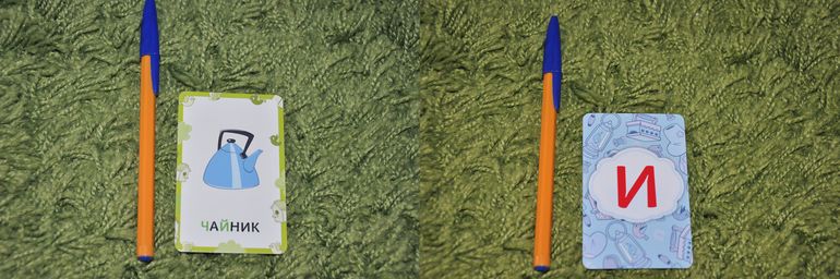 Карточки двухсторонние: с одной стороны картинка и подпись, с другой - буква:
