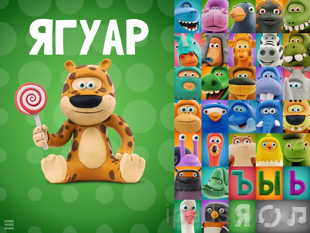 "Живая азбука" - отличное яркое приложение, озвученное детским голосом, воспроизводящее звуки и буквы. При это каждая картинка с буквой "живая", то есть на ней что-то происходит: например, едет автобус на "А" или футболист забивает гол на "Ф" и т.п.