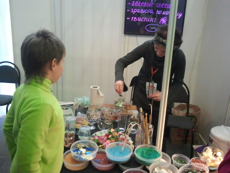 Деткам постарше предлагалось изготовить гелевую свечу (в обычном стаканчике - 500 р., в форменном - 700 или 750 р.). Очень интересное занятие! =) И чудесные свечи!