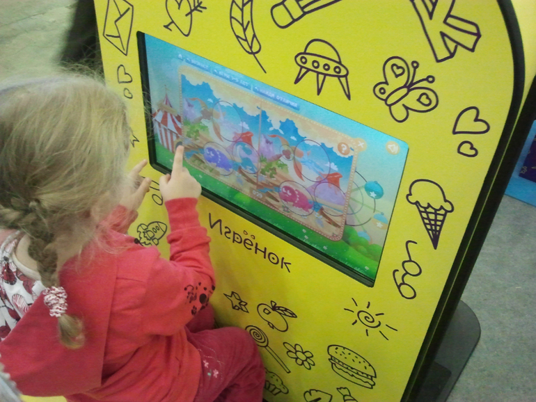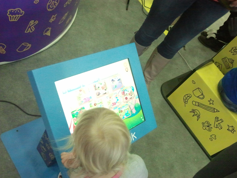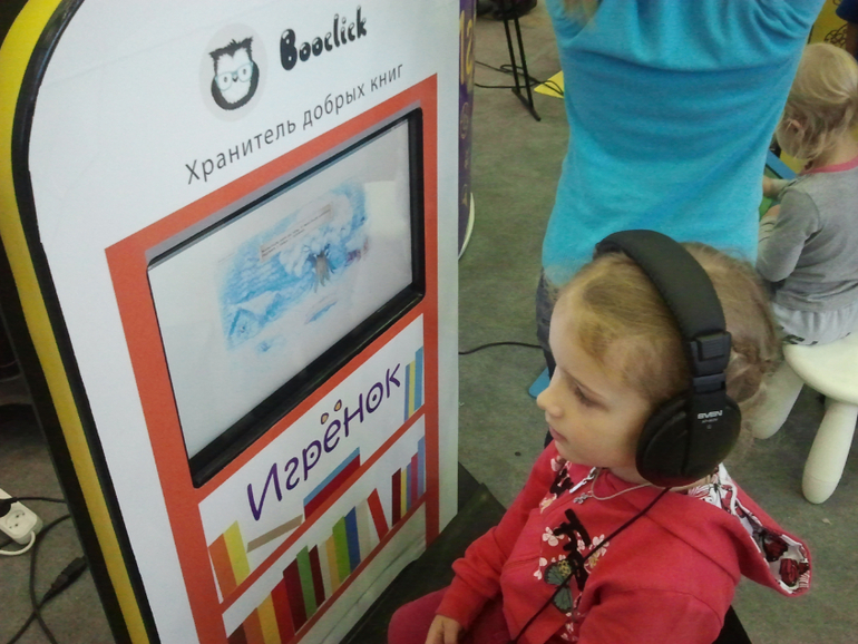 Были на выставке и интерактивные панели, на которых можно было послушать сказку или поиграть в игры. Здесь распространяли визитки со ссылкой на электронный ресурс, откуда можно скачать бесплатное приложение для iPAD.