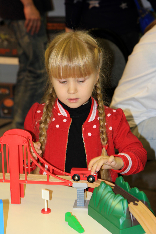 Потом дочка поиграла в деревянную железную дорогу. у нас такой игрушки нет, и она там подвисла ))) на этом же стенде можно было собирать домики из деревянных брусочков, это оказалось интересным занятием, да и брусочки такие приятные, тяжеленькие, плотные, деревянные. Тут же можно было купить любой понравившийся набор.
