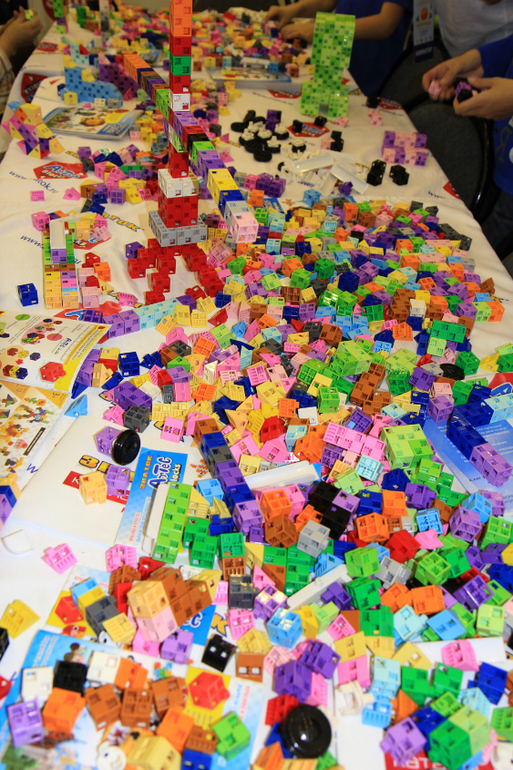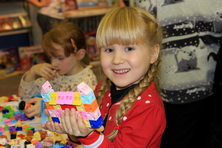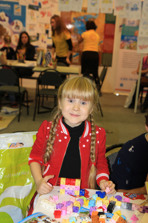 Пока доча зависала, разрисовывая лошадь, я быстренько обежала ближайшие павильоны. Увидела много игр Djeco, игрушки PlanToys (не дешевле, чем везде, поэтому заостряться не стала). Пообщалась с консультантами на стенде компании "Знаток". На выставке я смогла посмотреть пособие, которое меня очень интересовало. Вообще нельзя сказать, что на выставке было выгодно делать все покупки. по некоторым позициям - да, но большая часть продавалась дороже, например, майшопа или Лабиринта. Дочку я привела к стенду "Знатока" за стол, где дети играли в конструктор. Интересно, кубики даже по диагонали могут соединяться. Есть наборы с девочковыми пастельными цветами, есть наборы для мальчиков, есть наборы и большие, и маленькие, с колесиками и с глазами. Заинтересовалась, но остыла, узнав цену. За эти деньги я лучше Лего куплю.