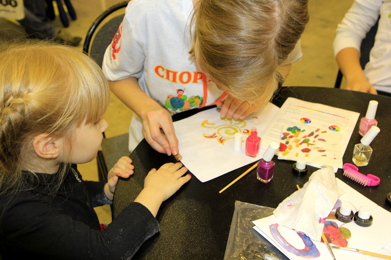 Потом был замечен стол, где делали бесплатный маникюр, с блестками, лаком на водной основе. (рукава все в живом песке). Пройти мимо было нереально.