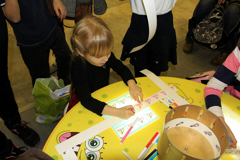 Были павильоны с планшетами, виртуальными играми, но я не хочу сейчас заострять внимание ребенка на компьютере и планшете, пусть в обычные игры наиграется, успеет еще (плюс у нас запрет категорический от офтальмолога). А потом Саня рисовала мультик. Готовый ФИЛЬМ я даже на телефон на видео сняла ))) Нужно было на бумажную ленту скопировать 16 рисунков последовательно (обвести трафареты), потом ленту помещают в металлический барабан с прорезями, раскручивают его, и через прорези смотрят, как прыгает нарисованная лягушка или плывет парусник. Наверное, это был единственный павильон, где была небольшая очередь, детям очень хотелось мультики порисовать.