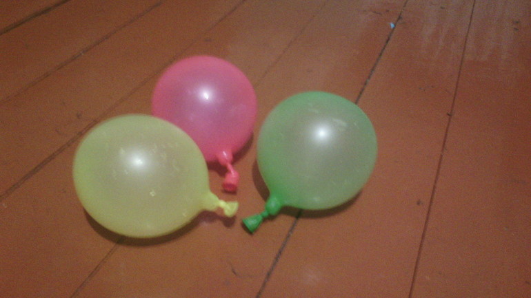 Еще один конкурс -- кто дальше прокатит шарик (немножко воды налила внутрь).Этот конкурс даже нашему папе понравился) Они действительно такие прикольные становятся, катать интересно и бросать куда-нибудь.