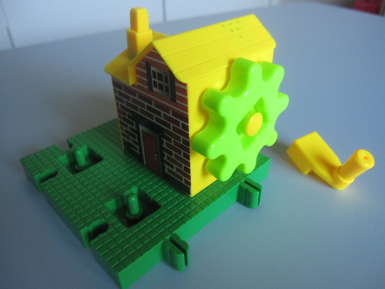 - домик с моторчиком внутри для автоматического вращения и ручка для механического вращения шестеренок